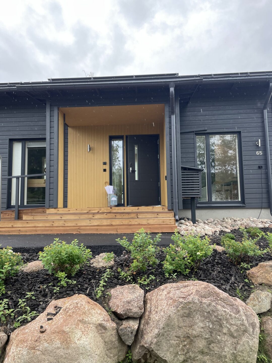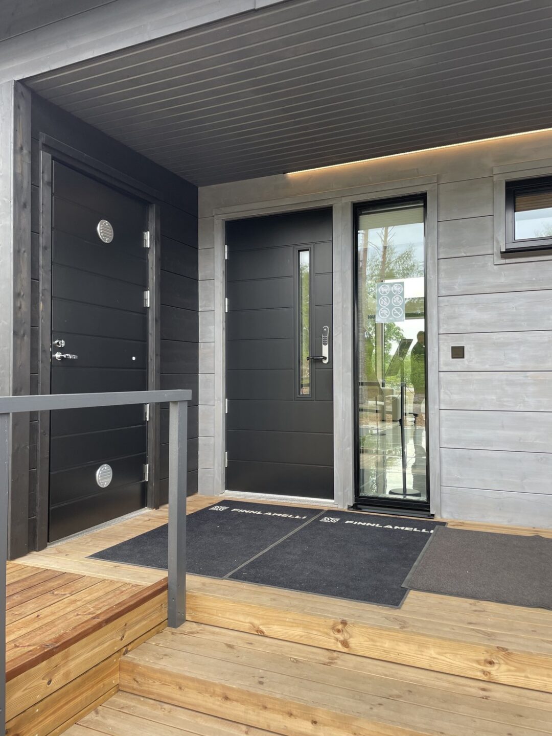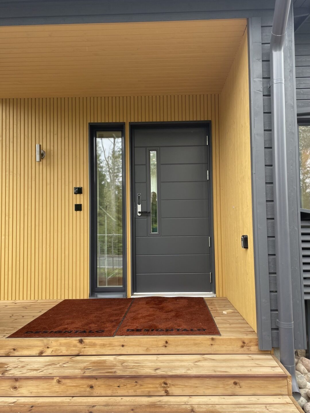 Kaikissa ulko-ovissamme on muotoiltu tuplatiiviste, karmissa ja kynnyksessä kiertää erikoisleveä Kaski-tiiviste. Karmi (53 mm) maalattua mäntyliimapuuta. Kynnys 25 mm sävytettyä koivua alumiiniprofiililla täyttää esteettömyysvaatimukset, kun kynnyksen alapinta asennetaan lattiatasoon.