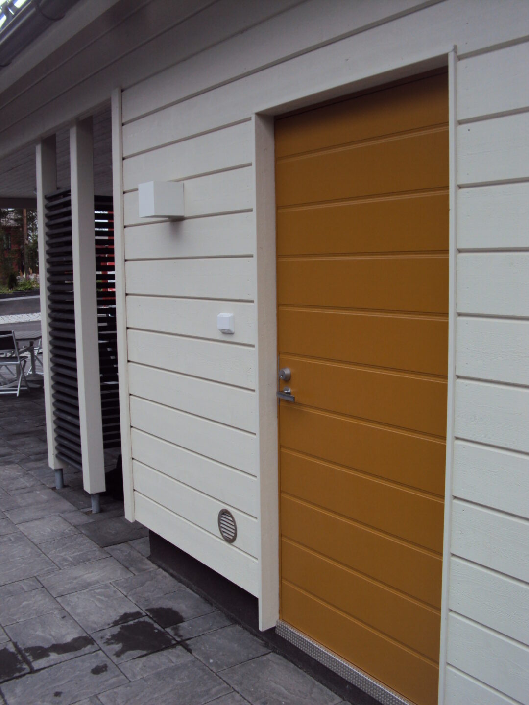 Ovilehden pinta on säänkestävää HDF-levyä, jäykisteenä alumiinilevy. Reunalla kiertää liimapuu. Kokonaisvahvuus 62mm. Muotoiltu tiiviste ovilehdessä. Eristeenä toimii polystyreeni. Karmi maalattua mäntyä. Kynnys koivua.